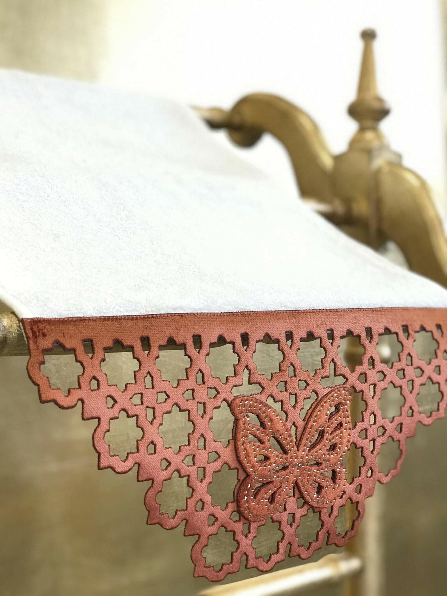 This design is a called Kelebek, meaning Butterly. Its Cut Through Premium Velvet Appliqués on a blend of Natural Bamboo and Organic Turkish Cotton Fabric will add refinement to any environment.