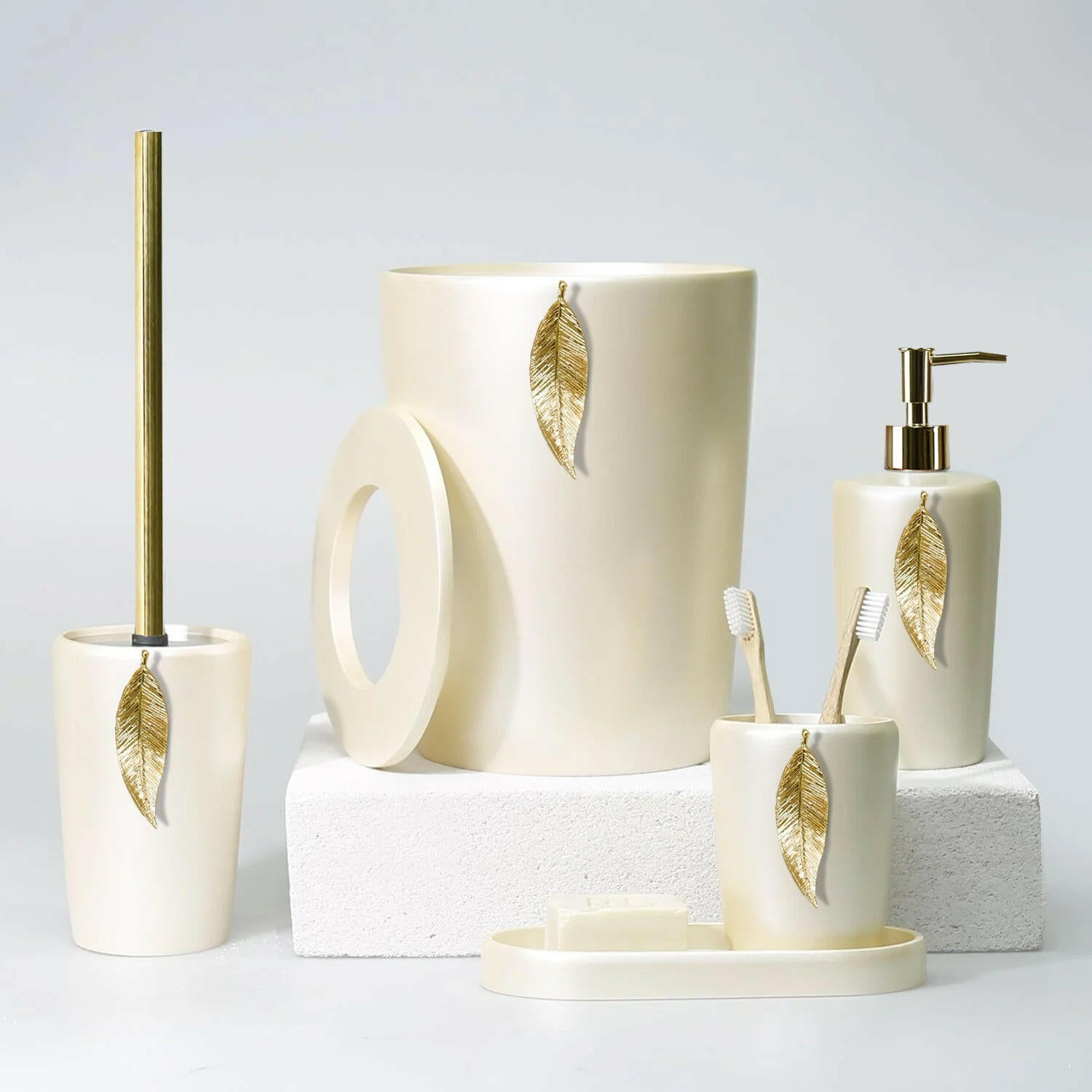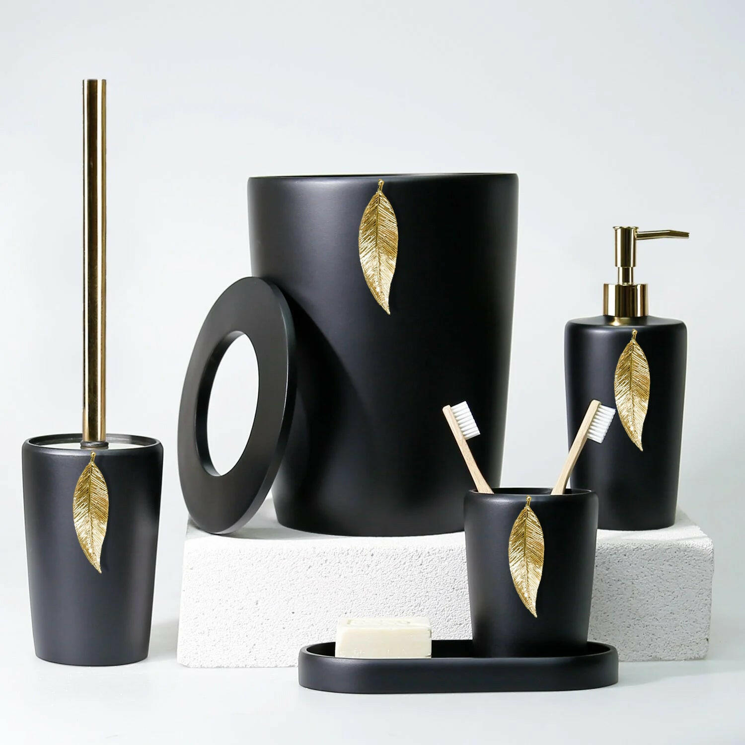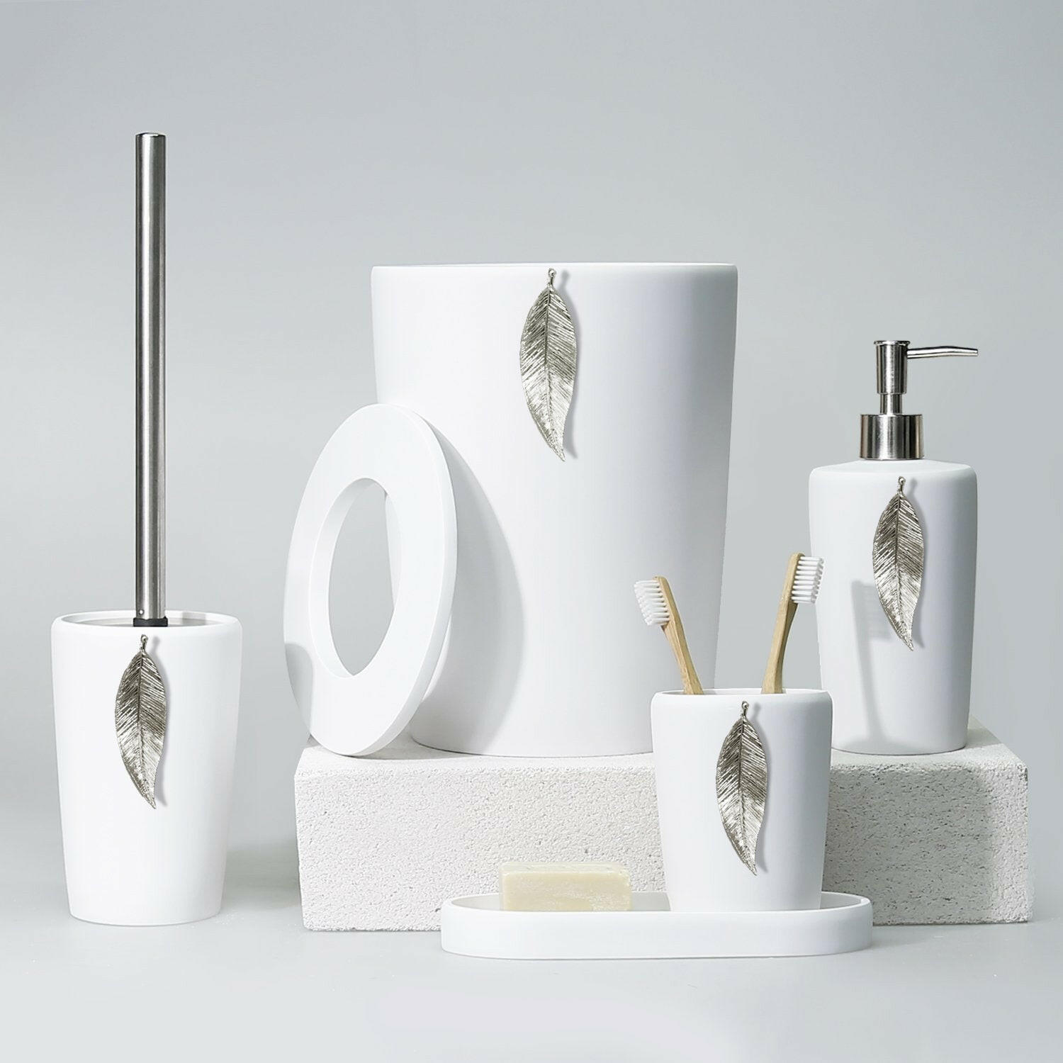Handmade from strong and resistant Resin, this elegant & chic Bath Set includes 5 pieces: